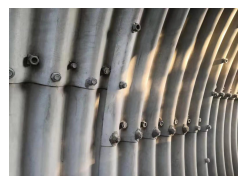 (1)、分片拼裝式波紋鋼結(jié)構(gòu),每片波紋鋼板面積只有2~3平方米,單節(jié)長度沿縱向長度只有1~1.5米,并且要求錯縫拼裝,接縫多。